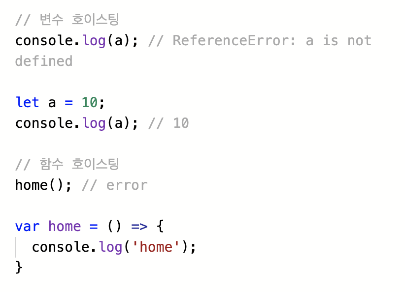 변수 a 가 선언되기 전에 참조하니 에러가 발생한다. 이는 호이스팅이 발생하지 않는 것이 아닌, 변수의 선언과 초기화 사이에 일시적으로 변수 값을 참조할 수 없는 구간인 TDZ(Temporal Dead Zone)에 빠졌기 때문에 보이는 현상이다.함수표현식을 사용하거나 let 또는 const 로 변수를 선언하는 경우, 자바스크립트 내부에서는 코드 실행 전 변수 선언만 해둘 뿐 초기화는 코드 실행 과정에서 변수 선언문을 만났을 때 수행하기 때문에 호이스팅이 발생하지 않은 것처럼 보이는 것이다. 호이스팅은 발생한다.