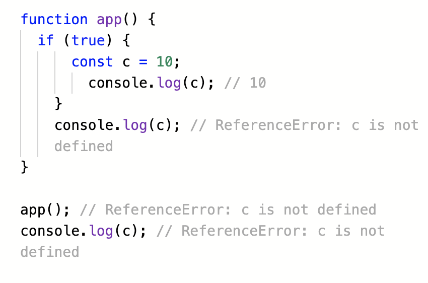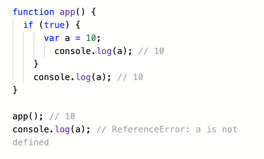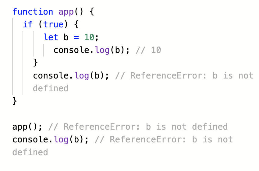 함수, if문, for문, while문, try/catch문 등의 모든 코드 블록 ({...}) 내부에서 선언된 변수는 코드 블록 내에서만 유효하고, 코드 블록 외부에서는 참조할 수 없다.