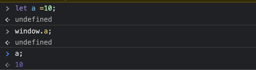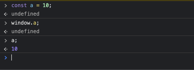 💡 let, const 키워드 예제let, const 로 선언된 변수는 전역객체 프로퍼티가 아니다.브라우저 환경에서 아래 코드 실행 해보면 let이나 const로 선언한 변수 a는 브라우저 전역객체인 window의 프로퍼티로 할당되지 않았음을 알 수 있다.