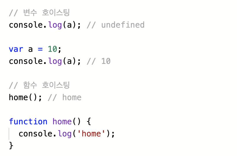 변수 호이스팅에서 선언된 변수 a가 앞에서 참조되었음에도 에러를 발생시키지 않는다. 이는 코드 실행 전에 자바스크립트 엔진이 미리 변수 선언하고, undefined로 초기화해 두었기 때문이다.함수선언문 또한 동일하게 선언되기 전 호출됨에도 에러가 발생하지 않는다.💡 let ,const 키워드 예제