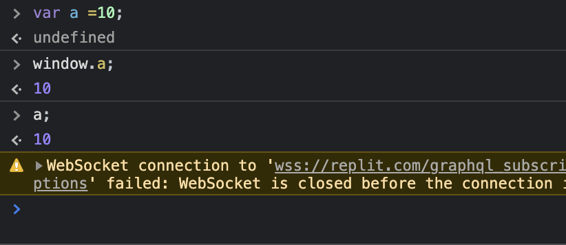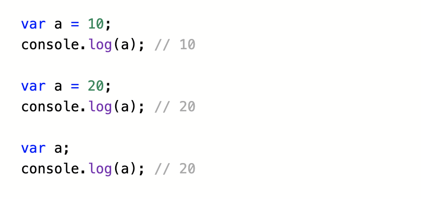 💡 var 키워드 예제var로 선언된 변수는 전역객체(브라우저 환경의 경우 window)의 프로퍼티다.브라우저 환경(크롬 콘솔 등)에서 아래 코드 실행해보면 var로 선언한 변수 a는 브라우저 전역객체인 window의 프로퍼티로 할당되는 것을 알 수 있다.