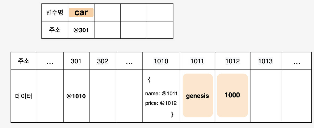 - 변수 car가 임의로 메모리 공간 301번지를 확보하였다.