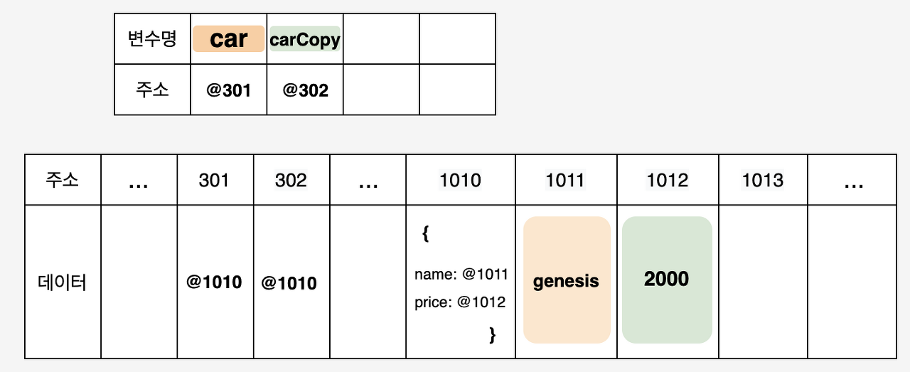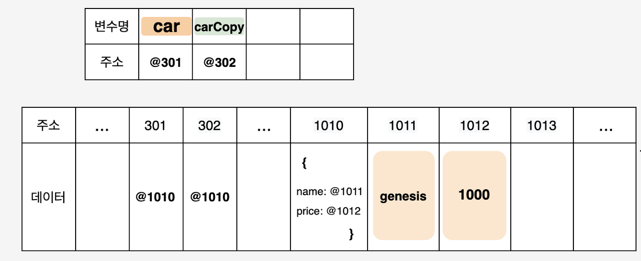 const car = { name: 'genesis', price: 1000, }; let carCopy = car; carCopy.price = 2000; console.log(car); // { name: 'genesis', price: 2000 } console.log(carCopy); // { name: 'genesis', price: 2000 }1️⃣ 변수 car에 객체값을 할당하였다.