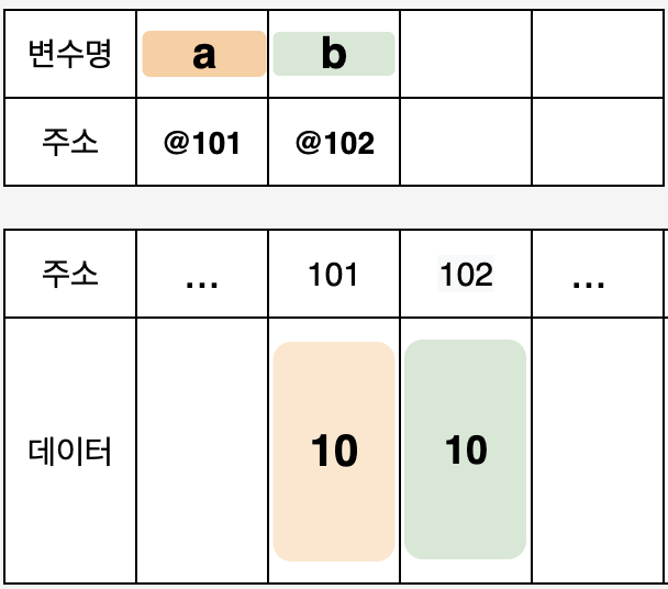 let a = 10; // 변수 a에 10을 할당 -> 변수 a가 메모리 공간 101번지를 확보하고, 변수 a와 매칭되어 있는 주소값인 101 저장 공간에 10이 저장 된다. let b = a; // 변수 b에 a를 할당 -> 메모리 공간 102번지 확보, 변수 c와 매칭된 주소값 102번지에 a가 저장 된다. console.log(a); // 10 console.log(b); // 10기본 자료형 값을 복사 할 때 복사된 값을 다른 메모리 공간에 할당하기 때문에 원래의 값과 복사된 값이 서로에게 영향을 미치지 않는다.