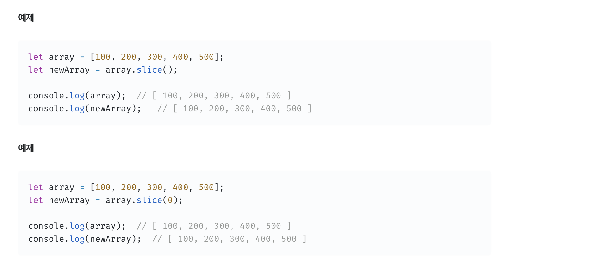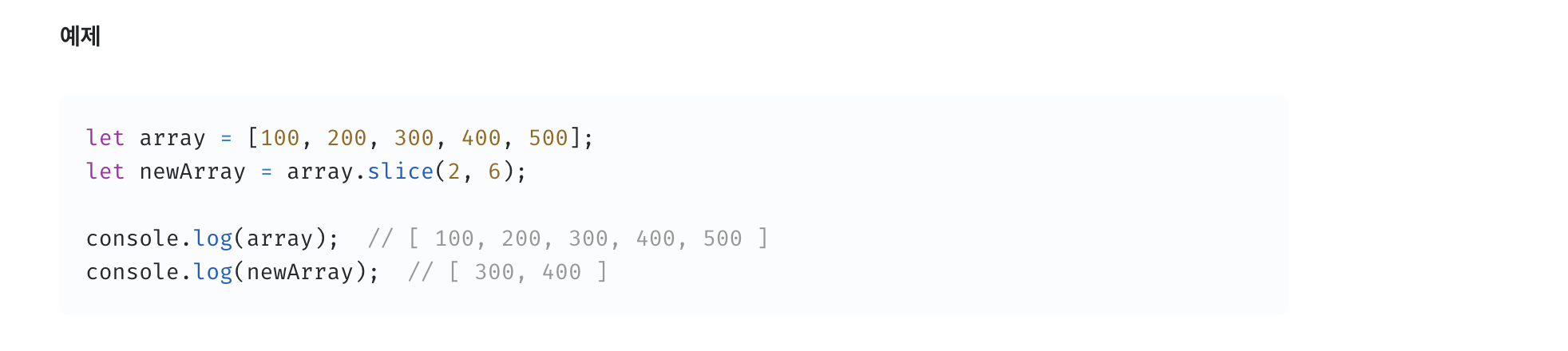 - 만약 end 값이 배열의 길이보다 크다면, silce()는 배열의 끝까지(arr.length) 추출