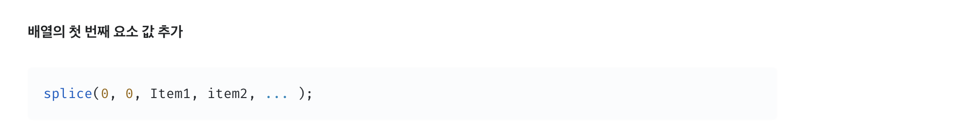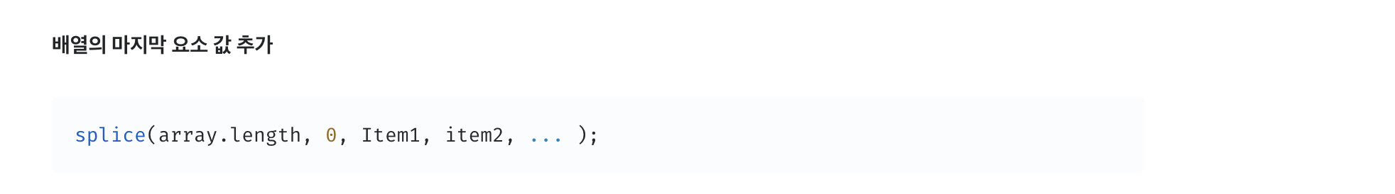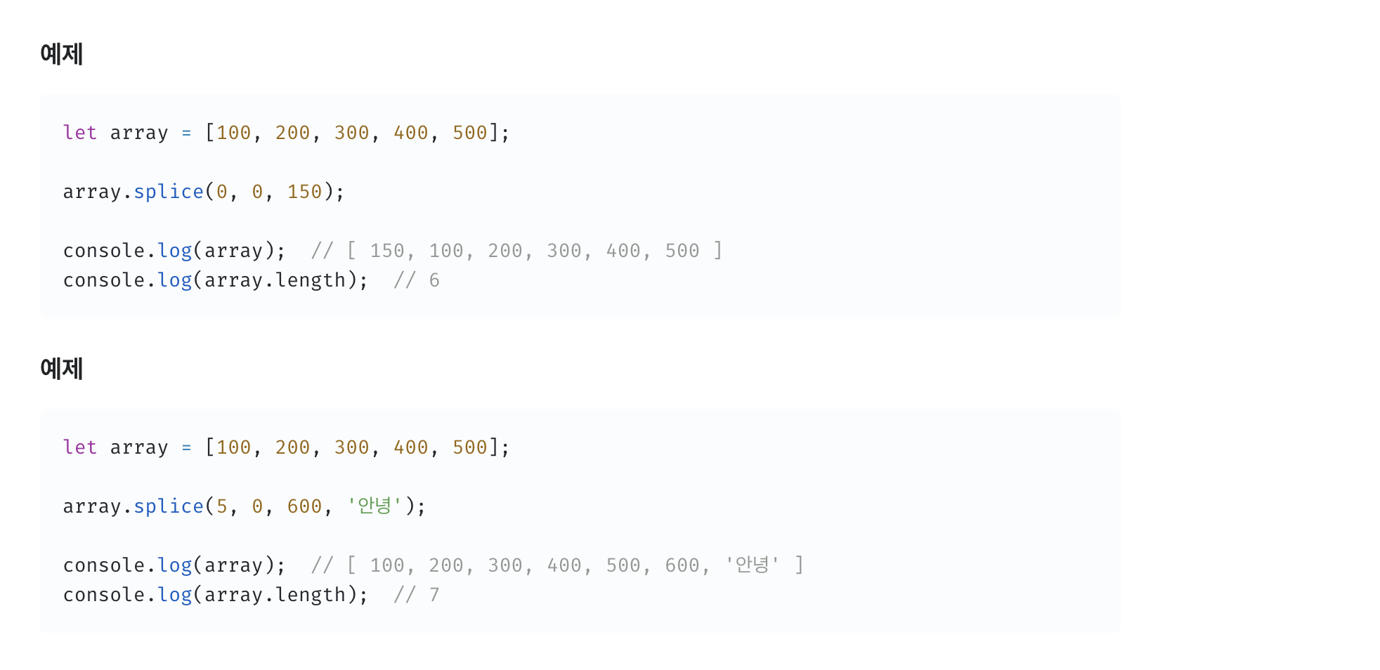 배열의 기존 요소를 삭제 또는 교체하거나 새 요소를 추가하여 배열의 내용을 변경한다.array.splice(startIndex, deleteCount, item1, item2, ...);☑️ startIndex (배열의 변경을 시작할 인덱스)