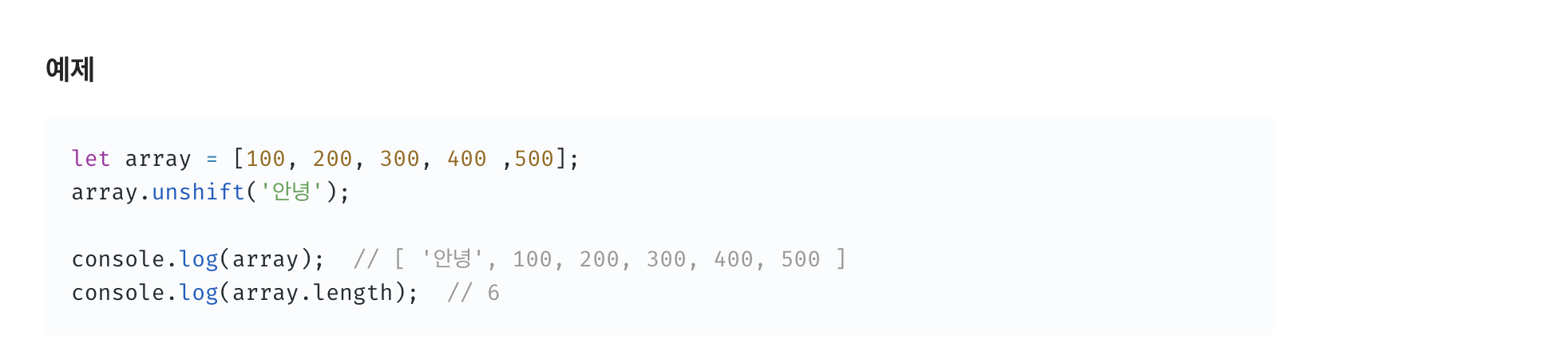 새로운 요소를 배열의 맨 앞쪽에 추가하고, 새로운 길이를 반환한다.